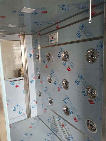 其工作原理是:經高效過濾器過濾后的潔凈氣流由可旋轉噴嘴從各個方向噴射至人身上,從而有效而迅速地清除塵埃粒子。清除后的塵埃粒子再經由初、高效過濾器過濾后重新循環到風淋區域內。