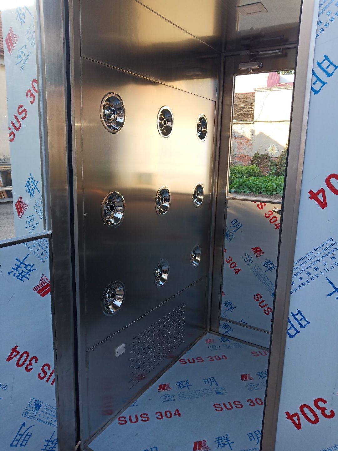 (3)拉開不銹鋼風(fēng)淋門人員進(jìn)入風(fēng)淋室后,風(fēng)淋門立即自動關(guān)閉外門,紅外線(聲控/人體熱能)感應(yīng),風(fēng)淋自動啟動,吹淋15秒(出廠已設(shè)置)。注意:風(fēng)淋室在吹淋時(shí)兩個(gè)不銹鋼門不能同時(shí)打開,如強(qiáng)行打開將損壞電子鎖,風(fēng)淋室兩門是電子互鎖控制。